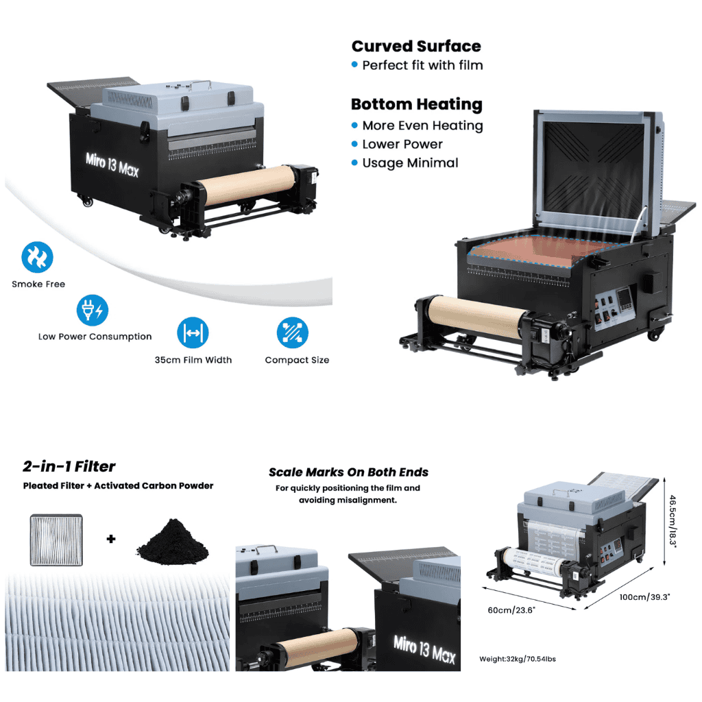 Miro 13 Max is the latest version of Auto-shaker based on Miro 13, it is DTF Station’s perfect powdering and curing solution for any A3 and A4 sized DTF printing setup. With bottom platen heating for even, consistently cured transfers and a built-in air purifier for safer, more eco-friendly powdering, this shaker helps make powdering your DTF transfers a breeze. Plus, at just 1170W (1.17KW), this shaker requires no special electrical adjustments to install or use. Coupled with its intuitive interface and a suite of videos by DTF Station on how to install, use, and maintain the shaker, you’ll be printing and powdering transfers in no time.