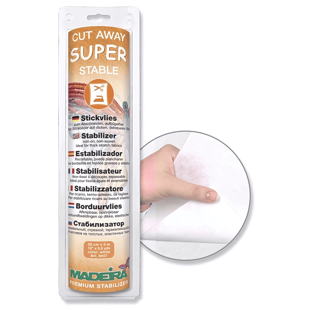 Super Stable is great for machine embroidery and appliqué as it remains on the fabric to keep it stable during and after embroidery. Iron in place whereever a permanent stabilizer might be used, stitch, and carefully cut away excess backing close to stitching.