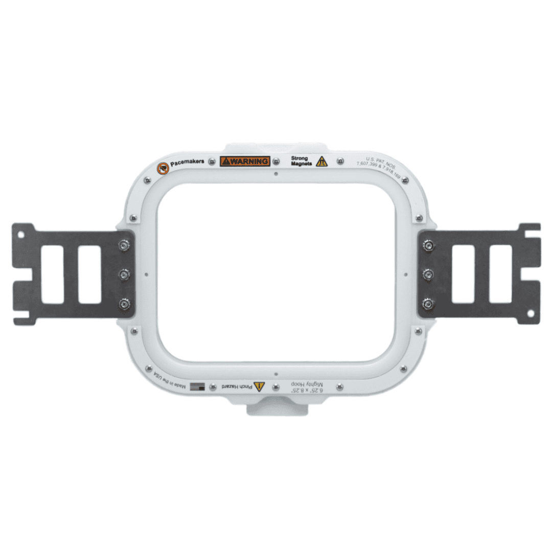 The Mighty Hoop is a new magnetic hoop that makes hooping very easy. There is no need to adjust the outer ring as the hoop holds the garment with magnetic force and automatically adjusts for different thicknesses. It also reduces the stress on your wrists and hands because it wants to pull itself together. Even for thick garments, there is very little pressure needed to apply the hoop. Hoop burn is greatly reduced because of the way the hoop holds the fabric. Unlike clamps, Mighty Hoops are designed to work with the HoopMaster for easy accurate hooping