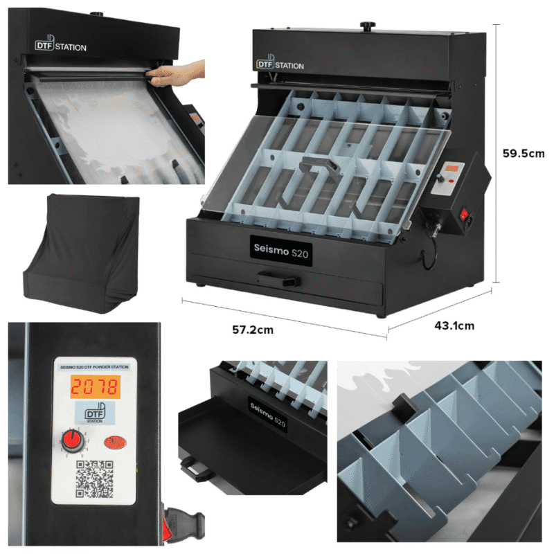 Seismo S20 is developed for a user’s desk-top working space, by shaking the powder manually, it is popular among the users who use their DTG printer to print DTF transfer in sheet together with DTF Station’s Phoenix Air 4050 oven, Seismo S20 would bring your DTF process to the next level.